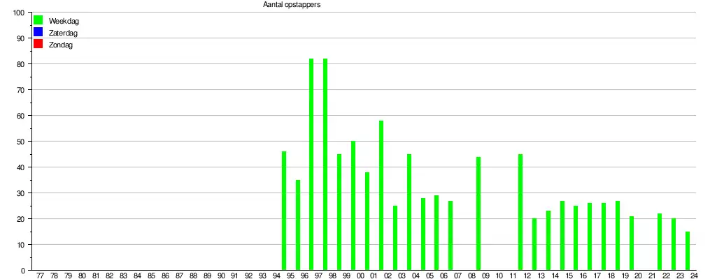 De grafiek en tabel geven het gemiddeld aantal instappende reizigers weer op een week-, zater- en zondag.[4]