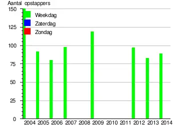 - ↑ De bron voor de gegevens zijn de jaarlijks door de NMBS in oktober uitgevoerde reizigerstellingen. Stationspersoneel en treinbegeleiders tellen dan visueel gedurende negen opeenvolgende dagen (vijf werkdagen en de twee aansluitende weekends) in alle stations en stopplaatsen het aantal instappende reizigers en dit voor alle binnenlandse treinen. De groene balk geeft het gemiddeld aantal opstappende (dus niet het aantal afstappende) reizigers weer op een weekdag (maandag, dinsdag, woensdag, donderdag en vrijdag opgeteld en gedeeld door vijf). Zaterdag wordt weergegeven door de blauwe en zondag door de rode balk. De cijfers geven een indicatie en hebben een foutenmarge, die in sommige gevallen aanzienlijk kan zijn. In 2008, 2010, 2011 en 2021 (corona) werden geen tellingen uitgevoerd. De gegevens zijn online raadpleegbaar, zoekterm Reizigerstellingen
