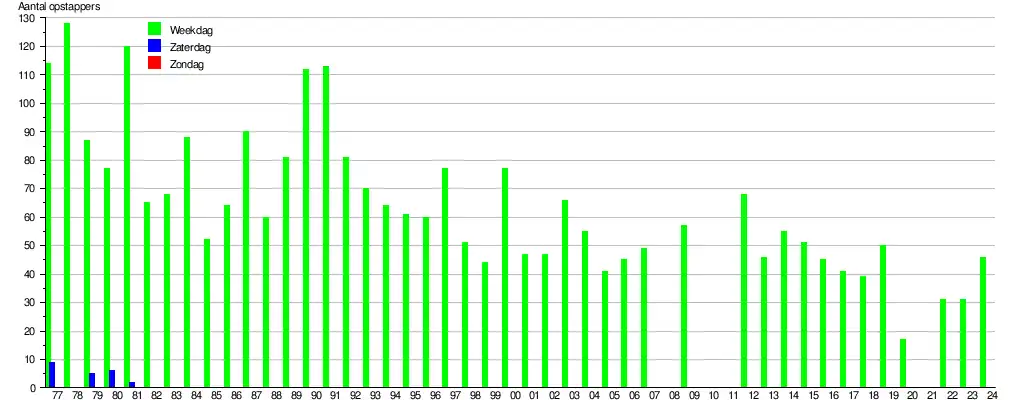 - ↑ De bron voor de gegevens zijn de jaarlijks door de NMBS in oktober uitgevoerde reizigerstellingen. Stationspersoneel en treinbegeleiders tellen dan visueel gedurende negen opeenvolgende dagen (vijf werkdagen en de twee aansluitende weekends) in alle stations en stopplaatsen het aantal instappende reizigers en dit voor alle binnenlandse treinen. De groene balk geeft het gemiddeld aantal opstappende (dus niet het aantal afstappende) reizigers weer op een weekdag (maandag, dinsdag, woensdag, donderdag en vrijdag opgeteld en gedeeld door vijf). Zaterdag wordt weergegeven door de blauwe en zondag door de rode balk. De cijfers geven een indicatie en hebben een foutenmarge, die in sommige gevallen aanzienlijk kan zijn. In 2008, 2010, 2011 en 2021 (corona) werden geen tellingen uitgevoerd. De gegevens zijn online raadpleegbaar, zoekterm Reizigerstellingen