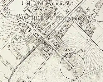 Kolonie Louisenbad, later Gesundbrunnen, in 1863. Het latere station ligt in de cirkel.