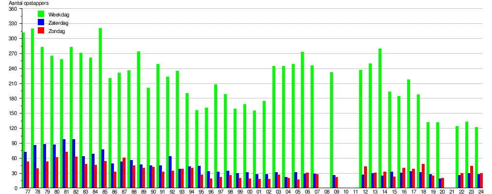 - ↑ De bron voor de gegevens zijn de jaarlijks door de NMBS in oktober uitgevoerde reizigerstellingen. Stationspersoneel en treinbegeleiders tellen dan visueel gedurende negen opeenvolgende dagen (vijf werkdagen en de twee aansluitende weekends) in alle stations en stopplaatsen het aantal instappende reizigers en dit voor alle binnenlandse treinen. De groene balk geeft het gemiddeld aantal opstappende (dus niet het aantal afstappende) reizigers weer op een weekdag (maandag, dinsdag, woensdag, donderdag en vrijdag opgeteld en gedeeld door vijf). Zaterdag wordt weergegeven door de blauwe en zondag door de rode balk. De cijfers geven een indicatie en hebben een foutenmarge, die in sommige gevallen aanzienlijk kan zijn. In 2008, 2010, 2011 en 2021 (corona) werden geen tellingen uitgevoerd. De gegevens zijn online raadpleegbaar, zoekterm Reizigerstellingen