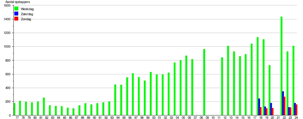 - ↑ De bron voor de gegevens zijn de jaarlijks door de NMBS in oktober uitgevoerde reizigerstellingen. Stationspersoneel en treinbegeleiders tellen dan visueel gedurende negen opeenvolgende dagen (vijf werkdagen en de twee aansluitende weekends) in alle stations en stopplaatsen het aantal instappende reizigers en dit voor alle binnenlandse treinen. De groene balk geeft het gemiddeld aantal opstappende (dus niet het aantal afstappende) reizigers weer op een weekdag (maandag, dinsdag, woensdag, donderdag en vrijdag opgeteld en gedeeld door vijf). Zaterdag wordt weergegeven door de blauwe en zondag door de rode balk. De cijfers geven een indicatie en hebben een foutenmarge, die in sommige gevallen aanzienlijk kan zijn. In 2008, 2010, 2011 en 2021 (corona) werden geen tellingen uitgevoerd. De gegevens zijn online raadpleegbaar, zoekterm Reizigerstellingen