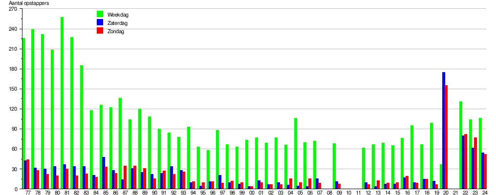De grafiek en tabel geven het gemiddeld aantal instappende reizigers weer op een week-, zater- en zondag.[4]