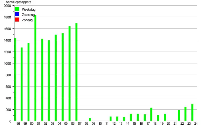- ↑ De bron voor de gegevens zijn de jaarlijks door de NMBS in oktober uitgevoerde reizigerstellingen. Stationspersoneel en treinbegeleiders tellen dan visueel gedurende negen opeenvolgende dagen (vijf werkdagen en de twee aansluitende weekends) in alle stations en stopplaatsen het aantal instappende reizigers en dit voor alle binnenlandse treinen. De groene balk geeft het gemiddeld aantal opstappende (dus niet het aantal afstappende) reizigers weer op een weekdag (maandag, dinsdag, woensdag, donderdag en vrijdag opgeteld en gedeeld door vijf). Zaterdag wordt weergegeven door de blauwe en zondag door de rode balk. De cijfers geven een indicatie en hebben een foutenmarge, die in sommige gevallen aanzienlijk kan zijn. In 2008, 2010, 2011 en 2021 (corona) werden geen tellingen uitgevoerd. De gegevens zijn online raadpleegbaar, zoekterm Reizigerstellingen