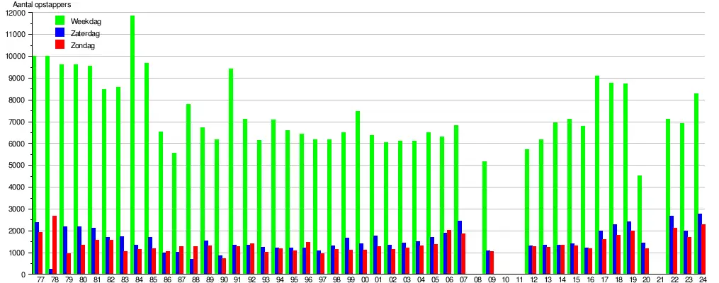 - ↑ De bron voor de gegevens zijn de jaarlijks door de NMBS in oktober uitgevoerde reizigerstellingen. Stationspersoneel en treinbegeleiders tellen dan visueel gedurende negen opeenvolgende dagen (vijf werkdagen en de twee aansluitende weekends) in alle stations en stopplaatsen het aantal instappende reizigers en dit voor alle binnenlandse treinen. De groene balk geeft het gemiddeld aantal opstappende (dus niet het aantal afstappende) reizigers weer op een weekdag (maandag, dinsdag, woensdag, donderdag en vrijdag opgeteld en gedeeld door vijf). Zaterdag wordt weergegeven door de blauwe en zondag door de rode balk. De cijfers geven een indicatie en hebben een foutenmarge, die in sommige gevallen aanzienlijk kan zijn. In 2008, 2010, 2011 en 2021 (corona) werden geen tellingen uitgevoerd. De gegevens zijn online raadpleegbaar, zoekterm Reizigerstellingen