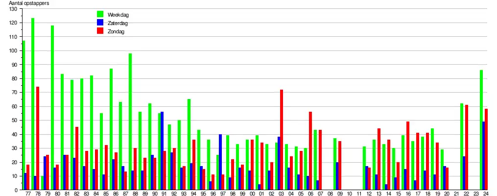 - ↑ De bron voor de gegevens zijn de jaarlijks door de NMBS in oktober uitgevoerde reizigerstellingen. Stationspersoneel en treinbegeleiders tellen dan visueel gedurende negen opeenvolgende dagen (vijf werkdagen en de twee aansluitende weekends) in alle stations en stopplaatsen het aantal instappende reizigers en dit voor alle binnenlandse treinen. De groene balk geeft het gemiddeld aantal opstappende (dus niet het aantal afstappende) reizigers weer op een weekdag (maandag, dinsdag, woensdag, donderdag en vrijdag opgeteld en gedeeld door vijf). Zaterdag wordt weergegeven door de blauwe en zondag door de rode balk. De cijfers geven een indicatie en hebben een foutenmarge, die in sommige gevallen aanzienlijk kan zijn. In 2008, 2010, 2011 en 2021 (corona) werden geen tellingen uitgevoerd. De gegevens zijn online raadpleegbaar, zoekterm Reizigerstellingen