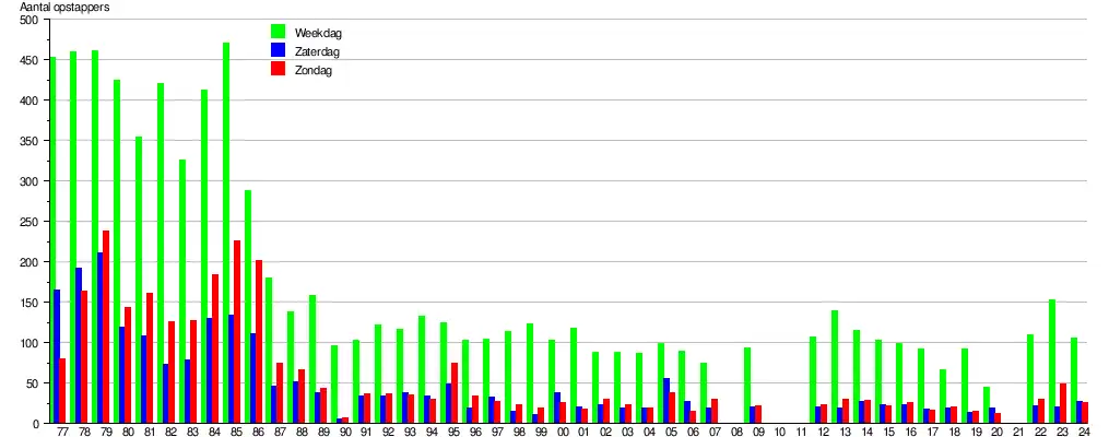 - ↑ De bron voor de gegevens zijn de jaarlijks door de NMBS in oktober uitgevoerde reizigerstellingen. Stationspersoneel en treinbegeleiders tellen dan visueel gedurende negen opeenvolgende dagen (vijf werkdagen en de twee aansluitende weekends) in alle stations en stopplaatsen het aantal instappende reizigers en dit voor alle binnenlandse treinen. De groene balk geeft het gemiddeld aantal opstappende (dus niet het aantal afstappende) reizigers weer op een weekdag (maandag, dinsdag, woensdag, donderdag en vrijdag opgeteld en gedeeld door vijf). Zaterdag wordt weergegeven door de blauwe en zondag door de rode balk. De cijfers geven een indicatie en hebben een foutenmarge, die in sommige gevallen aanzienlijk kan zijn. In 2008, 2010, 2011 en 2021 (corona) werden geen tellingen uitgevoerd. De gegevens zijn online raadpleegbaar, zoekterm Reizigerstellingen