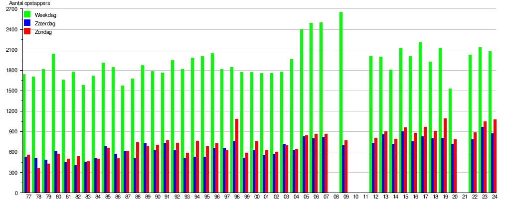- ↑ De bron voor de gegevens zijn de jaarlijks door de NMBS in oktober uitgevoerde reizigerstellingen. Stationspersoneel en treinbegeleiders tellen dan visueel gedurende negen opeenvolgende dagen (vijf werkdagen en de twee aansluitende weekends) in alle stations en stopplaatsen het aantal instappende reizigers en dit voor alle binnenlandse treinen. De groene balk geeft het gemiddeld aantal opstappende (dus niet het aantal afstappende) reizigers weer op een weekdag (maandag, dinsdag, woensdag, donderdag en vrijdag opgeteld en gedeeld door vijf). Zaterdag wordt weergegeven door de blauwe en zondag door de rode balk. De cijfers geven een indicatie en hebben een foutenmarge, die in sommige gevallen aanzienlijk kan zijn. In 2008, 2010, 2011 en 2021 (corona) werden geen tellingen uitgevoerd. De gegevens zijn online raadpleegbaar, zoekterm Reizigerstellingen