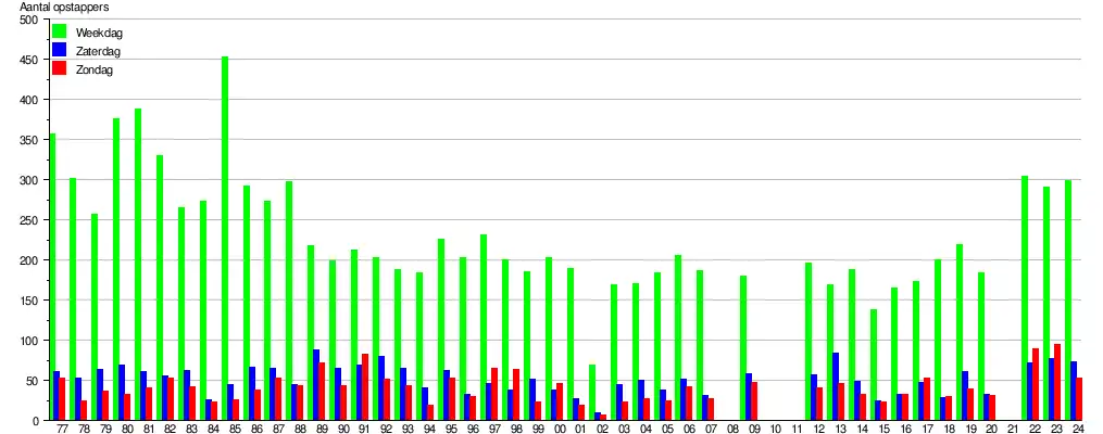 - ↑ De bron voor de gegevens zijn de jaarlijks door de NMBS in oktober uitgevoerde reizigerstellingen. Stationspersoneel en treinbegeleiders tellen dan visueel gedurende negen opeenvolgende dagen (vijf werkdagen en de twee aansluitende weekends) in alle stations en stopplaatsen het aantal instappende reizigers en dit voor alle binnenlandse treinen. De groene balk geeft het gemiddeld aantal opstappende (dus niet het aantal afstappende) reizigers weer op een weekdag (maandag, dinsdag, woensdag, donderdag en vrijdag opgeteld en gedeeld door vijf). Zaterdag wordt weergegeven door de blauwe en zondag door de rode balk. De cijfers geven een indicatie en hebben een foutenmarge, die in sommige gevallen aanzienlijk kan zijn. In 2008, 2010, 2011 en 2021 (corona) werden geen tellingen uitgevoerd. De gegevens zijn online raadpleegbaar, zoekterm Reizigerstellingen