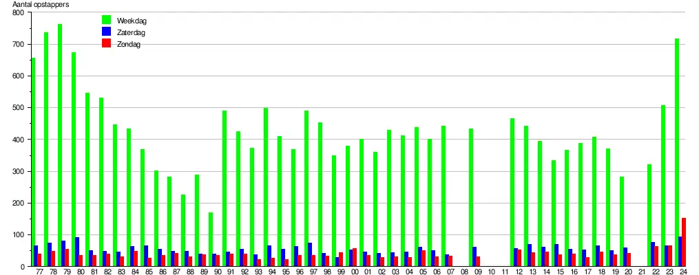 - ↑ De bron voor de gegevens zijn de jaarlijks door de NMBS in oktober uitgevoerde reizigerstellingen. Stationspersoneel en treinbegeleiders tellen dan visueel gedurende negen opeenvolgende dagen (vijf werkdagen en de twee aansluitende weekends) in alle stations en stopplaatsen het aantal instappende reizigers en dit voor alle binnenlandse treinen. De groene balk geeft het gemiddeld aantal opstappende (dus niet het aantal afstappende) reizigers weer op een weekdag (maandag, dinsdag, woensdag, donderdag en vrijdag opgeteld en gedeeld door vijf). Zaterdag wordt weergegeven door de blauwe en zondag door de rode balk. De cijfers geven een indicatie en hebben een foutenmarge, die in sommige gevallen aanzienlijk kan zijn. In 2008, 2010, 2011 en 2021 (corona) werden geen tellingen uitgevoerd. De gegevens zijn online raadpleegbaar, zoekterm Reizigerstellingen