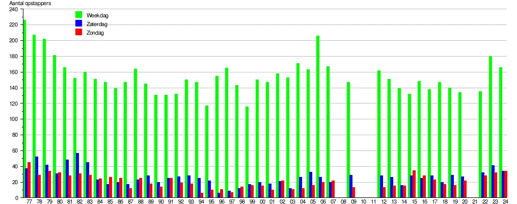 De grafiek en tabel geven het gemiddeld aantal instappende reizigers weer op een week-, zater- en zondag.[2]