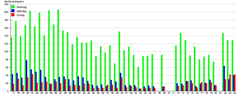 - ↑ De bron voor de gegevens zijn de jaarlijks door de NMBS in oktober uitgevoerde reizigerstellingen. Stationspersoneel en treinbegeleiders tellen dan visueel gedurende negen opeenvolgende dagen (vijf werkdagen en de twee aansluitende weekends) in alle stations en stopplaatsen het aantal instappende reizigers en dit voor alle binnenlandse treinen. De groene balk geeft het gemiddeld aantal opstappende (dus niet het aantal afstappende) reizigers weer op een weekdag (maandag, dinsdag, woensdag, donderdag en vrijdag opgeteld en gedeeld door vijf). Zaterdag wordt weergegeven door de blauwe en zondag door de rode balk. De cijfers geven een indicatie en hebben een foutenmarge, die in sommige gevallen aanzienlijk kan zijn. In 2008, 2010, 2011 en 2021 (corona) werden geen tellingen uitgevoerd. De gegevens zijn online raadpleegbaar, zoekterm Reizigerstellingen