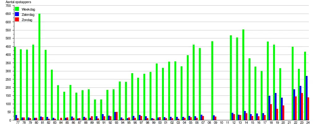 - ↑ De bron voor de gegevens zijn de jaarlijks door de NMBS in oktober uitgevoerde reizigerstellingen. Stationspersoneel en treinbegeleiders tellen dan visueel gedurende negen opeenvolgende dagen (vijf werkdagen en de twee aansluitende weekends) in alle stations en stopplaatsen het aantal instappende reizigers en dit voor alle binnenlandse treinen. De groene balk geeft het gemiddeld aantal opstappende (dus niet het aantal afstappende) reizigers weer op een weekdag (maandag, dinsdag, woensdag, donderdag en vrijdag opgeteld en gedeeld door vijf). Zaterdag wordt weergegeven door de blauwe en zondag door de rode balk. De cijfers geven een indicatie en hebben een foutenmarge, die in sommige gevallen aanzienlijk kan zijn. In 2008, 2010, 2011 en 2021 (corona) werden geen tellingen uitgevoerd. De gegevens zijn online raadpleegbaar, zoekterm Reizigerstellingen