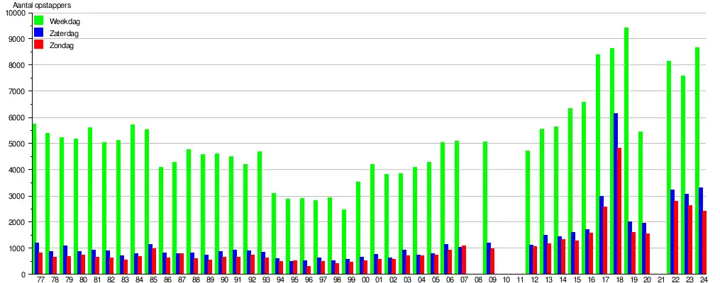 - ↑ De bron voor de gegevens zijn de jaarlijks door de NMBS in oktober uitgevoerde reizigerstellingen. Stationspersoneel en treinbegeleiders tellen dan visueel gedurende negen opeenvolgende dagen (vijf werkdagen en de twee aansluitende weekends) in alle stations en stopplaatsen het aantal instappende reizigers en dit voor alle binnenlandse treinen. De groene balk geeft het gemiddeld aantal opstappende (dus niet het aantal afstappende) reizigers weer op een weekdag (maandag, dinsdag, woensdag, donderdag en vrijdag opgeteld en gedeeld door vijf). Zaterdag wordt weergegeven door de blauwe en zondag door de rode balk. De cijfers geven een indicatie en hebben een foutenmarge, die in sommige gevallen aanzienlijk kan zijn. In 2008, 2010, 2011 en 2021 (corona) werden geen tellingen uitgevoerd. De gegevens zijn online raadpleegbaar, zoekterm Reizigerstellingen