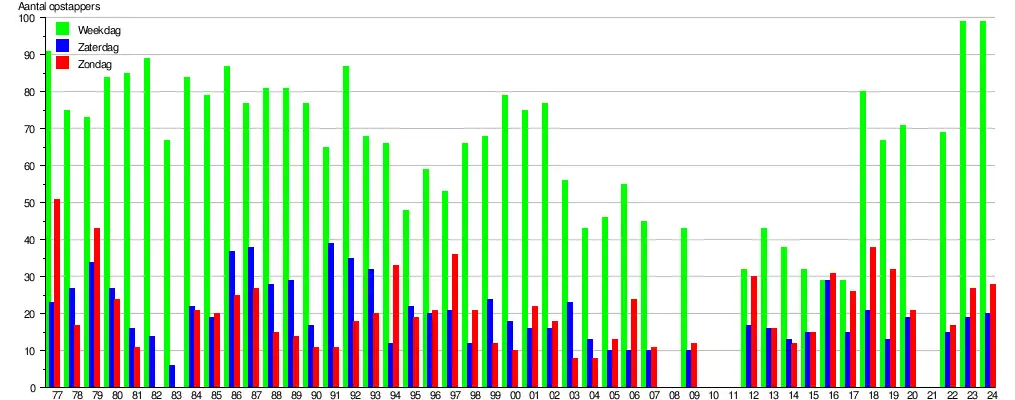 - ↑ De bron voor de gegevens zijn de jaarlijks door de NMBS in oktober uitgevoerde reizigerstellingen. Stationspersoneel en treinbegeleiders tellen dan visueel gedurende negen opeenvolgende dagen (vijf werkdagen en de twee aansluitende weekends) in alle stations en stopplaatsen het aantal instappende reizigers en dit voor alle binnenlandse treinen. De groene balk geeft het gemiddeld aantal opstappende (dus niet het aantal afstappende) reizigers weer op een weekdag (maandag, dinsdag, woensdag, donderdag en vrijdag opgeteld en gedeeld door vijf). Zaterdag wordt weergegeven door de blauwe en zondag door de rode balk. De cijfers geven een indicatie en hebben een foutenmarge, die in sommige gevallen aanzienlijk kan zijn. In 2008, 2010, 2011 en 2021 (corona) werden geen tellingen uitgevoerd. De gegevens zijn online raadpleegbaar, zoekterm Reizigerstellingen