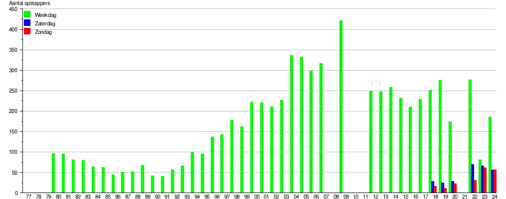 - ↑ De bron voor de gegevens zijn de jaarlijks door de NMBS in oktober uitgevoerde reizigerstellingen. Stationspersoneel en treinbegeleiders tellen dan visueel gedurende negen opeenvolgende dagen (vijf werkdagen en de twee aansluitende weekends) in alle stations en stopplaatsen het aantal instappende reizigers en dit voor alle binnenlandse treinen. De groene balk geeft het gemiddeld aantal opstappende (dus niet het aantal afstappende) reizigers weer op een weekdag (maandag, dinsdag, woensdag, donderdag en vrijdag opgeteld en gedeeld door vijf). Zaterdag wordt weergegeven door de blauwe en zondag door de rode balk. De cijfers geven een indicatie en hebben een foutenmarge, die in sommige gevallen aanzienlijk kan zijn. In 2008, 2010, 2011 en 2021 (corona) werden geen tellingen uitgevoerd. De gegevens zijn online raadpleegbaar, zoekterm Reizigerstellingen