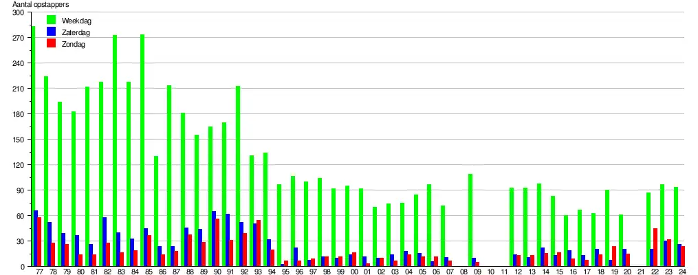 - ↑ De bron voor de gegevens zijn de jaarlijks door de NMBS in oktober uitgevoerde reizigerstellingen. Stationspersoneel en treinbegeleiders tellen dan visueel gedurende negen opeenvolgende dagen (vijf werkdagen en de twee aansluitende weekends) in alle stations en stopplaatsen het aantal instappende reizigers en dit voor alle binnenlandse treinen. De groene balk geeft het gemiddeld aantal opstappende (dus niet het aantal afstappende) reizigers weer op een weekdag (maandag, dinsdag, woensdag, donderdag en vrijdag opgeteld en gedeeld door vijf). Zaterdag wordt weergegeven door de blauwe en zondag door de rode balk. De cijfers geven een indicatie en hebben een foutenmarge, die in sommige gevallen aanzienlijk kan zijn. In 2008, 2010, 2011 en 2021 (corona) werden geen tellingen uitgevoerd. De gegevens zijn online raadpleegbaar, zoekterm Reizigerstellingen