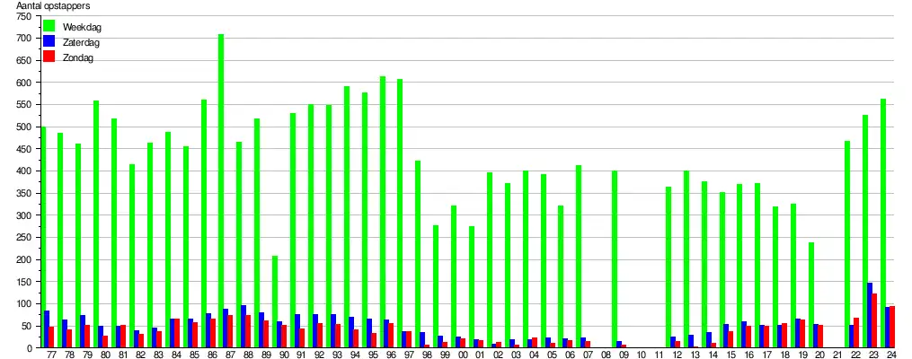 - ↑ De bron voor de gegevens zijn de jaarlijks door de NMBS in oktober uitgevoerde reizigerstellingen. Stationspersoneel en treinbegeleiders tellen dan visueel gedurende negen opeenvolgende dagen (vijf werkdagen en de twee aansluitende weekends) in alle stations en stopplaatsen het aantal instappende reizigers en dit voor alle binnenlandse treinen. De groene balk geeft het gemiddeld aantal opstappende (dus niet het aantal afstappende) reizigers weer op een weekdag (maandag, dinsdag, woensdag, donderdag en vrijdag opgeteld en gedeeld door vijf). Zaterdag wordt weergegeven door de blauwe en zondag door de rode balk. De cijfers geven een indicatie en hebben een foutenmarge, die in sommige gevallen aanzienlijk kan zijn. In 2008, 2010, 2011 en 2021 (corona) werden geen tellingen uitgevoerd. De gegevens zijn online raadpleegbaar, zoekterm Reizigerstellingen