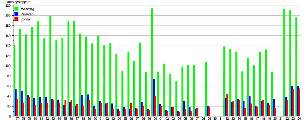 - ↑ De bron voor de gegevens zijn de jaarlijks door de NMBS in oktober uitgevoerde reizigerstellingen. Stationspersoneel en treinbegeleiders tellen dan visueel gedurende negen opeenvolgende dagen (vijf werkdagen en de twee aansluitende weekends) in alle stations en stopplaatsen het aantal instappende reizigers en dit voor alle binnenlandse treinen. De groene balk geeft het gemiddeld aantal opstappende (dus niet het aantal afstappende) reizigers weer op een weekdag (maandag, dinsdag, woensdag, donderdag en vrijdag opgeteld en gedeeld door vijf). Zaterdag wordt weergegeven door de blauwe en zondag door de rode balk. De cijfers geven een indicatie en hebben een foutenmarge, die in sommige gevallen aanzienlijk kan zijn. In 2008, 2010, 2011 en 2021 (corona) werden geen tellingen uitgevoerd. De gegevens zijn online raadpleegbaar, zoekterm Reizigerstellingen