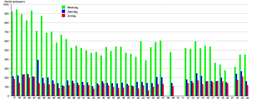 - ↑ De bron voor de gegevens zijn de jaarlijks door de NMBS in oktober uitgevoerde reizigerstellingen. Stationspersoneel en treinbegeleiders tellen dan visueel gedurende negen opeenvolgende dagen (vijf werkdagen en de twee aansluitende weekends) in alle stations en stopplaatsen het aantal instappende reizigers en dit voor alle binnenlandse treinen. De groene balk geeft het gemiddeld aantal opstappende (dus niet het aantal afstappende) reizigers weer op een weekdag (maandag, dinsdag, woensdag, donderdag en vrijdag opgeteld en gedeeld door vijf). Zaterdag wordt weergegeven door de blauwe en zondag door de rode balk. De cijfers geven een indicatie en hebben een foutenmarge, die in sommige gevallen aanzienlijk kan zijn. In 2008, 2010, 2011 en 2021 (corona) werden geen tellingen uitgevoerd. De gegevens zijn online raadpleegbaar, zoekterm Reizigerstellingen