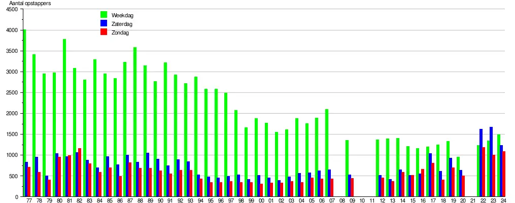 De grafiek en tabel geven het gemiddeld aantal instappende reizigers weer op een week-, zater- en zondag.[2]