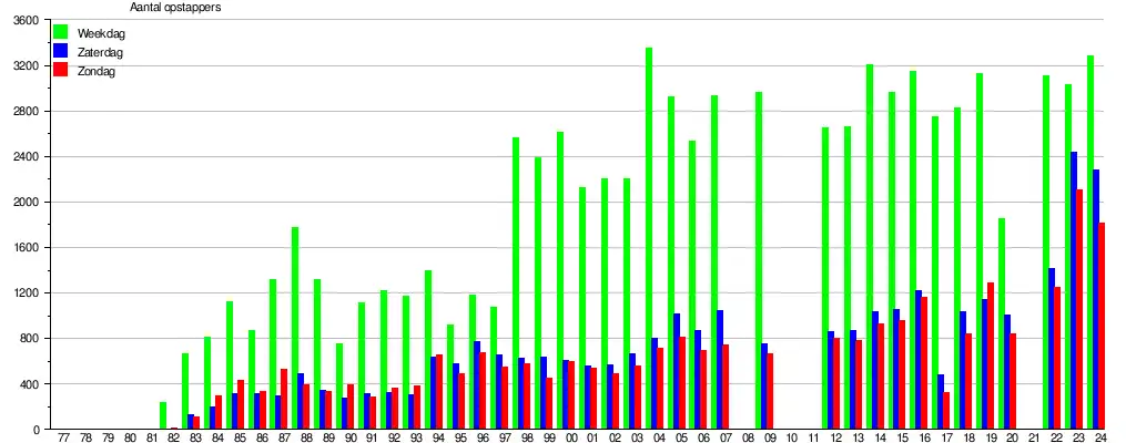 - ↑ De bron voor de gegevens zijn de jaarlijks door de NMBS in oktober uitgevoerde reizigerstellingen. Stationspersoneel en treinbegeleiders tellen dan visueel gedurende negen opeenvolgende dagen (vijf werkdagen en de twee aansluitende weekends) in alle stations en stopplaatsen het aantal instappende reizigers en dit voor alle binnenlandse treinen. De groene balk geeft het gemiddeld aantal opstappende (dus niet het aantal afstappende) reizigers weer op een weekdag (maandag, dinsdag, woensdag, donderdag en vrijdag opgeteld en gedeeld door vijf). Zaterdag wordt weergegeven door de blauwe en zondag door de rode balk. De cijfers geven een indicatie en hebben een foutenmarge, die in sommige gevallen aanzienlijk kan zijn. In 2008, 2010, 2011 en 2021 (corona) werden geen tellingen uitgevoerd. De gegevens zijn online raadpleegbaar, zoekterm Reizigerstellingen