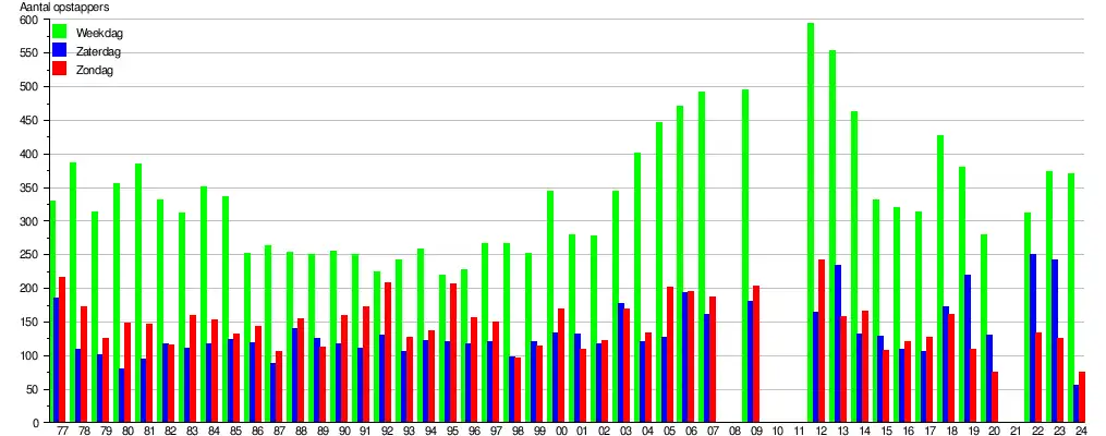 - ↑ De bron voor de gegevens zijn de jaarlijks door de NMBS in oktober uitgevoerde reizigerstellingen. Stationspersoneel en treinbegeleiders tellen dan visueel gedurende negen opeenvolgende dagen (vijf werkdagen en de twee aansluitende weekends) in alle stations en stopplaatsen het aantal instappende reizigers en dit voor alle binnenlandse treinen. De groene balk geeft het gemiddeld aantal opstappende (dus niet het aantal afstappende) reizigers weer op een weekdag (maandag, dinsdag, woensdag, donderdag en vrijdag opgeteld en gedeeld door vijf). Zaterdag wordt weergegeven door de blauwe en zondag door de rode balk. De cijfers geven een indicatie en hebben een foutenmarge, die in sommige gevallen aanzienlijk kan zijn. In 2008, 2010, 2011 en 2021 (corona) werden geen tellingen uitgevoerd. De gegevens zijn online raadpleegbaar, zoekterm Reizigerstellingen