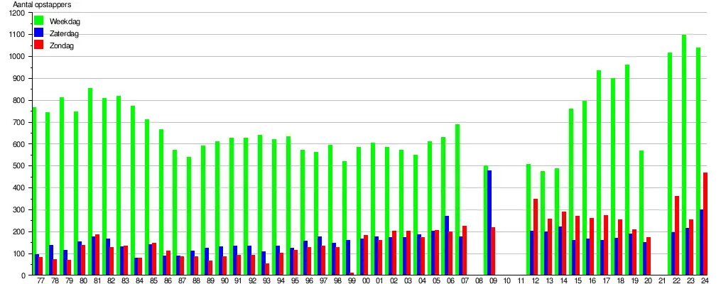 - ↑ De bron voor de gegevens zijn de jaarlijks door de NMBS in oktober uitgevoerde reizigerstellingen. Stationspersoneel en treinbegeleiders tellen dan visueel gedurende negen opeenvolgende dagen (vijf werkdagen en de twee aansluitende weekends) in alle stations en stopplaatsen het aantal instappende reizigers en dit voor alle binnenlandse treinen. De groene balk geeft het gemiddeld aantal opstappende (dus niet het aantal afstappende) reizigers weer op een weekdag (maandag, dinsdag, woensdag, donderdag en vrijdag opgeteld en gedeeld door vijf). Zaterdag wordt weergegeven door de blauwe en zondag door de rode balk. De cijfers geven een indicatie en hebben een foutenmarge, die in sommige gevallen aanzienlijk kan zijn. In 2008, 2010, 2011 en 2021 (corona) werden geen tellingen uitgevoerd. De gegevens zijn online raadpleegbaar, zoekterm Reizigerstellingen