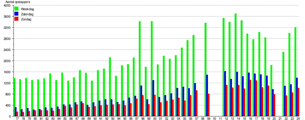 - ↑ De bron voor de gegevens zijn de jaarlijks door de NMBS in oktober uitgevoerde reizigerstellingen. Stationspersoneel en treinbegeleiders tellen dan visueel gedurende negen opeenvolgende dagen (vijf werkdagen en de twee aansluitende weekends) in alle stations en stopplaatsen het aantal instappende reizigers en dit voor alle binnenlandse treinen. De groene balk geeft het gemiddeld aantal opstappende (dus niet het aantal afstappende) reizigers weer op een weekdag (maandag, dinsdag, woensdag, donderdag en vrijdag opgeteld en gedeeld door vijf). Zaterdag wordt weergegeven door de blauwe en zondag door de rode balk. De cijfers geven een indicatie en hebben een foutenmarge, die in sommige gevallen aanzienlijk kan zijn. In 2008, 2010, 2011 en 2021 (corona) werden geen tellingen uitgevoerd. De gegevens zijn online raadpleegbaar, zoekterm Reizigerstellingen