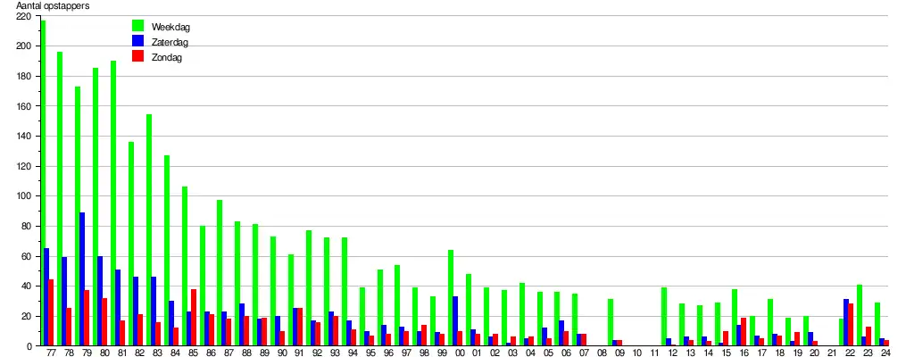 De grafiek en tabel geven het gemiddeld aantal instappende reizigers weer op een week-, zater- en zondag.[3]