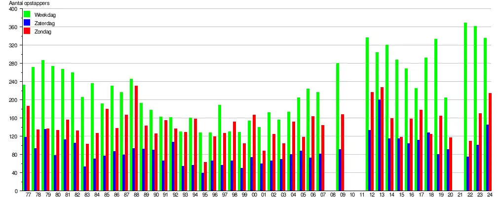 - ↑ De bron voor de gegevens zijn de jaarlijks door de NMBS in oktober uitgevoerde reizigerstellingen. Stationspersoneel en treinbegeleiders tellen dan visueel gedurende negen opeenvolgende dagen (vijf werkdagen en de twee aansluitende weekends) in alle stations en stopplaatsen het aantal instappende reizigers en dit voor alle binnenlandse treinen. De groene balk geeft het gemiddeld aantal opstappende (dus niet het aantal afstappende) reizigers weer op een weekdag (maandag, dinsdag, woensdag, donderdag en vrijdag opgeteld en gedeeld door vijf). Zaterdag wordt weergegeven door de blauwe en zondag door de rode balk. De cijfers geven een indicatie en hebben een foutenmarge, die in sommige gevallen aanzienlijk kan zijn. In 2008, 2010, 2011 en 2021 (corona) werden geen tellingen uitgevoerd. De gegevens zijn online raadpleegbaar, zoekterm Reizigerstellingen