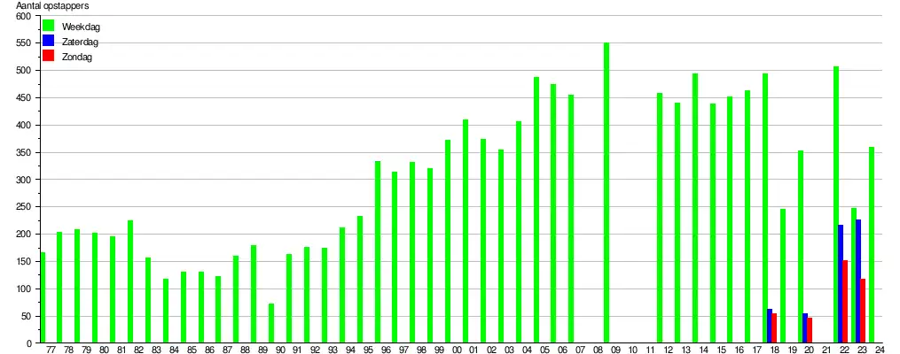 - ↑ De bron voor de gegevens zijn de jaarlijks door de NMBS in oktober uitgevoerde reizigerstellingen. Stationspersoneel en treinbegeleiders tellen dan visueel gedurende negen opeenvolgende dagen (vijf werkdagen en de twee aansluitende weekends) in alle stations en stopplaatsen het aantal instappende reizigers en dit voor alle binnenlandse treinen. De groene balk geeft het gemiddeld aantal opstappende (dus niet het aantal afstappende) reizigers weer op een weekdag (maandag, dinsdag, woensdag, donderdag en vrijdag opgeteld en gedeeld door vijf). Zaterdag wordt weergegeven door de blauwe en zondag door de rode balk. De cijfers geven een indicatie en hebben een foutenmarge, die in sommige gevallen aanzienlijk kan zijn. In 2008, 2010, 2011 en 2021 (corona) werden geen tellingen uitgevoerd. De gegevens zijn online raadpleegbaar, zoekterm Reizigerstellingen