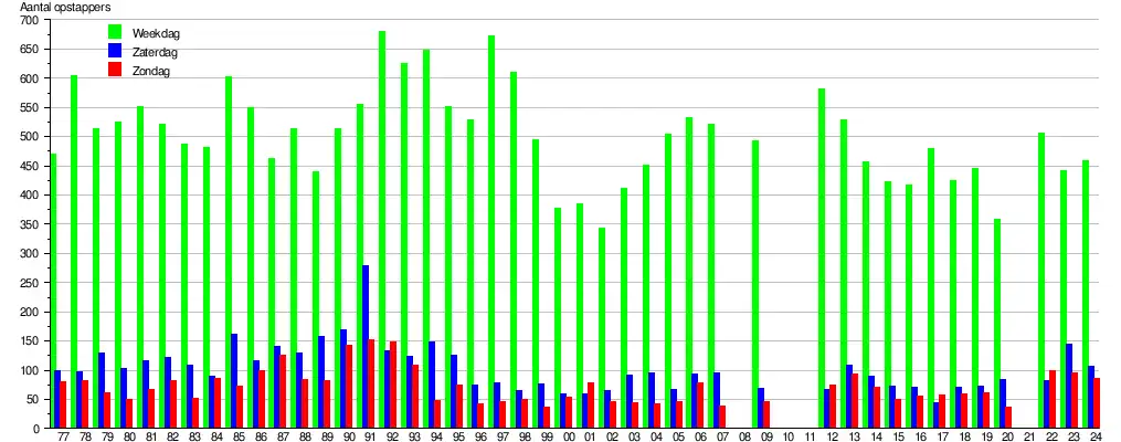 - ↑ De bron voor de gegevens zijn de jaarlijks door de NMBS in oktober uitgevoerde reizigerstellingen. Stationspersoneel en treinbegeleiders tellen dan visueel gedurende negen opeenvolgende dagen (vijf werkdagen en de twee aansluitende weekends) in alle stations en stopplaatsen het aantal instappende reizigers en dit voor alle binnenlandse treinen. De groene balk geeft het gemiddeld aantal opstappende (dus niet het aantal afstappende) reizigers weer op een weekdag (maandag, dinsdag, woensdag, donderdag en vrijdag opgeteld en gedeeld door vijf). Zaterdag wordt weergegeven door de blauwe en zondag door de rode balk. De cijfers geven een indicatie en hebben een foutenmarge, die in sommige gevallen aanzienlijk kan zijn. In 2008, 2010, 2011 en 2021 (corona) werden geen tellingen uitgevoerd. De gegevens zijn online raadpleegbaar, zoekterm Reizigerstellingen