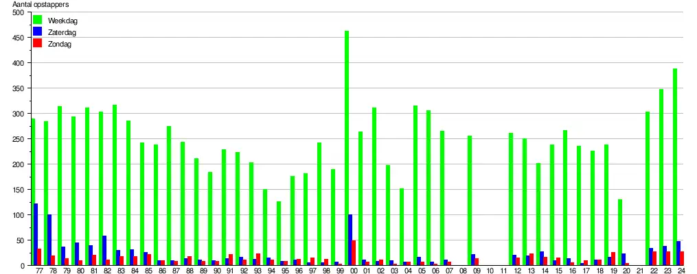 - ↑ De bron voor de gegevens zijn de jaarlijks door de NMBS in oktober uitgevoerde reizigerstellingen. Stationspersoneel en treinbegeleiders tellen dan visueel gedurende negen opeenvolgende dagen (vijf werkdagen en de twee aansluitende weekends) in alle stations en stopplaatsen het aantal instappende reizigers en dit voor alle binnenlandse treinen. De groene balk geeft het gemiddeld aantal opstappende (dus niet het aantal afstappende) reizigers weer op een weekdag (maandag, dinsdag, woensdag, donderdag en vrijdag opgeteld en gedeeld door vijf). Zaterdag wordt weergegeven door de blauwe en zondag door de rode balk. De cijfers geven een indicatie en hebben een foutenmarge, die in sommige gevallen aanzienlijk kan zijn. In 2008, 2010, 2011 en 2021 (corona) werden geen tellingen uitgevoerd. De gegevens zijn online raadpleegbaar, zoekterm Reizigerstellingen