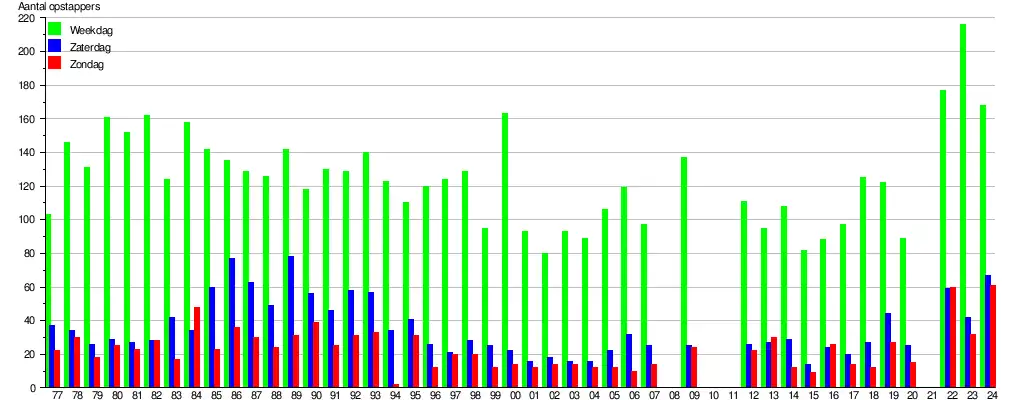 - ↑ De bron voor de gegevens zijn de jaarlijks door de NMBS in oktober uitgevoerde reizigerstellingen. Stationspersoneel en treinbegeleiders tellen dan visueel gedurende negen opeenvolgende dagen (vijf werkdagen en de twee aansluitende weekends) in alle stations en stopplaatsen het aantal instappende reizigers en dit voor alle binnenlandse treinen. De groene balk geeft het gemiddeld aantal opstappende (dus niet het aantal afstappende) reizigers weer op een weekdag (maandag, dinsdag, woensdag, donderdag en vrijdag opgeteld en gedeeld door vijf). Zaterdag wordt weergegeven door de blauwe en zondag door de rode balk. De cijfers geven een indicatie en hebben een foutenmarge, die in sommige gevallen aanzienlijk kan zijn. In 2008, 2010, 2011 en 2021 (corona) werden geen tellingen uitgevoerd. De gegevens zijn online raadpleegbaar, zoekterm Reizigerstellingen
