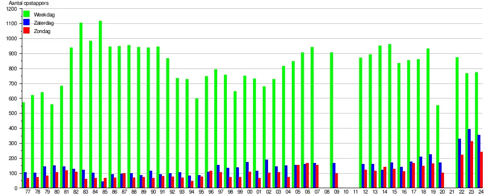 - ↑ De bron voor de gegevens zijn de jaarlijks door de NMBS in oktober uitgevoerde reizigerstellingen. Stationspersoneel en treinbegeleiders tellen dan visueel gedurende negen opeenvolgende dagen (vijf werkdagen en de twee aansluitende weekends) in alle stations en stopplaatsen het aantal instappende reizigers en dit voor alle binnenlandse treinen. De groene balk geeft het gemiddeld aantal opstappende (dus niet het aantal afstappende) reizigers weer op een weekdag (maandag, dinsdag, woensdag, donderdag en vrijdag opgeteld en gedeeld door vijf). Zaterdag wordt weergegeven door de blauwe en zondag door de rode balk. De cijfers geven een indicatie en hebben een foutenmarge, die in sommige gevallen aanzienlijk kan zijn. In 2008, 2010, 2011 en 2021 (corona) werden geen tellingen uitgevoerd. De gegevens zijn online raadpleegbaar, zoekterm Reizigerstellingen