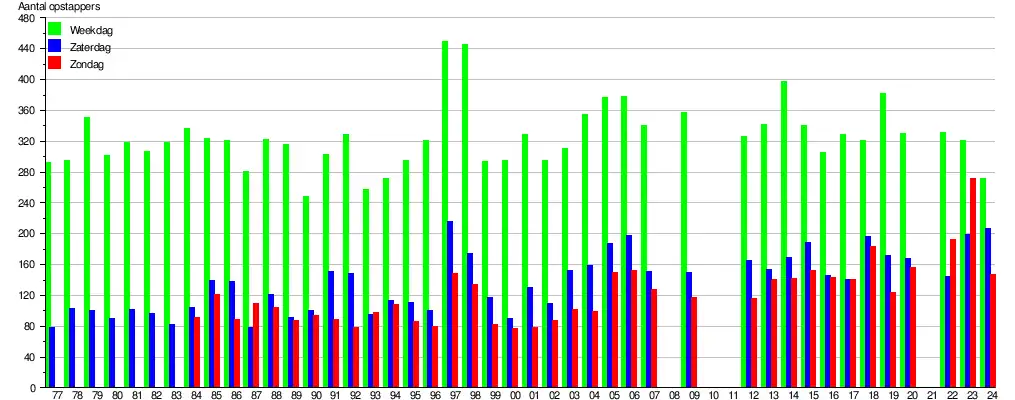 - ↑ De bron voor de gegevens zijn de jaarlijks door de NMBS in oktober uitgevoerde reizigerstellingen. Stationspersoneel en treinbegeleiders tellen dan visueel gedurende negen opeenvolgende dagen (vijf werkdagen en de twee aansluitende weekends) in alle stations en stopplaatsen het aantal instappende reizigers en dit voor alle binnenlandse treinen. De groene balk geeft het gemiddeld aantal opstappende (dus niet het aantal afstappende) reizigers weer op een weekdag (maandag, dinsdag, woensdag, donderdag en vrijdag opgeteld en gedeeld door vijf). Zaterdag wordt weergegeven door de blauwe en zondag door de rode balk. De cijfers geven een indicatie en hebben een foutenmarge, die in sommige gevallen aanzienlijk kan zijn. In 2008, 2010, 2011 en 2021 (corona) werden geen tellingen uitgevoerd. De gegevens zijn online raadpleegbaar, zoekterm Reizigerstellingen