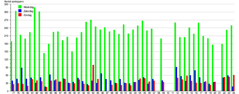 - ↑ De bron voor de gegevens zijn de jaarlijks door de NMBS in oktober uitgevoerde reizigerstellingen. Stationspersoneel en treinbegeleiders tellen dan visueel gedurende negen opeenvolgende dagen (vijf werkdagen en de twee aansluitende weekends) in alle stations en stopplaatsen het aantal instappende reizigers en dit voor alle binnenlandse treinen. De groene balk geeft het gemiddeld aantal opstappende (dus niet het aantal afstappende) reizigers weer op een weekdag (maandag, dinsdag, woensdag, donderdag en vrijdag opgeteld en gedeeld door vijf). Zaterdag wordt weergegeven door de blauwe en zondag door de rode balk. De cijfers geven een indicatie en hebben een foutenmarge, die in sommige gevallen aanzienlijk kan zijn. In 2008, 2010, 2011 en 2021 (corona) werden geen tellingen uitgevoerd. De gegevens zijn online raadpleegbaar, zoekterm Reizigerstellingen