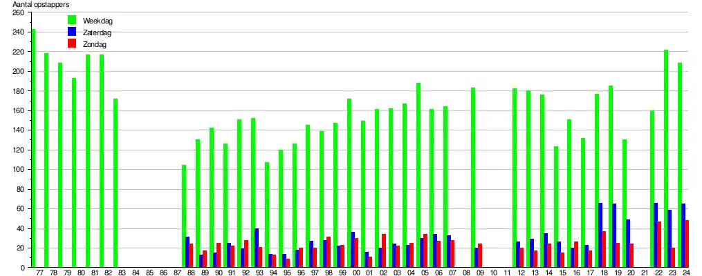 - ↑ De bron voor de gegevens zijn de jaarlijks door de NMBS in oktober uitgevoerde reizigerstellingen. Stationspersoneel en treinbegeleiders tellen dan visueel gedurende negen opeenvolgende dagen (vijf werkdagen en de twee aansluitende weekends) in alle stations en stopplaatsen het aantal instappende reizigers en dit voor alle binnenlandse treinen. De groene balk geeft het gemiddeld aantal opstappende (dus niet het aantal afstappende) reizigers weer op een weekdag (maandag, dinsdag, woensdag, donderdag en vrijdag opgeteld en gedeeld door vijf). Zaterdag wordt weergegeven door de blauwe en zondag door de rode balk. De cijfers geven een indicatie en hebben een foutenmarge, die in sommige gevallen aanzienlijk kan zijn. In 2008, 2010, 2011 en 2021 (corona) werden geen tellingen uitgevoerd. De gegevens zijn online raadpleegbaar, zoekterm Reizigerstellingen