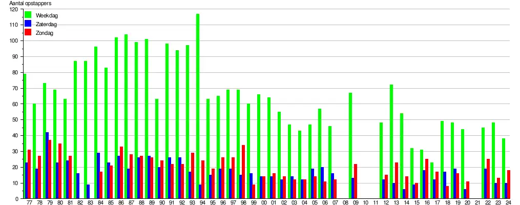 De grafiek en tabel geven het gemiddeld aantal instappende reizigers weer op een week-, zater- en zondag.[2]