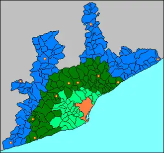 - Tweede Zone: Wordt beschouwd als het aangrenzende gebied van de metropool. Het vormt een stedengordel met steden als Vilanova i la Geltrú, Vilafranca del Penedès, Martorell, Terrassa, Sabadell, Granollers, Mataró en respectievelijk hun invloedsgebieden. De Generalitat beschouwt de samenhang van dit gebied door middel van de ringspoorlijn.