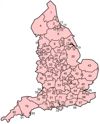 Buckinghamshire, Cambridgeshire, Cumbria, Derbyshire, Devon, East Sussex, Essex, Gloucestershire, Hampshire, Hertfordshire, Kent, Lancashire, Leicestershire, Lincolnshire, Norfolk, Northamptonshire, North Yorkshire, Nottinghamshire, Oxfordshire, Somerset, Staffordshire, Suffolk, Surrey, Warwickshire, West Sussex, Worcestershire