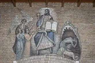 De kerk is in 1939 voorzien van wandschilderingen van de hand van de Friese schilder Jacob Ydema. Boven de hoofdingang van de kerk is Christus afgebeeld rechter in het laatste oordeel. Hij zit op een troon, schetsmatig gesuggereerd, met aan zijn rechterzijde (links van de beschouwer) een engel met de “goede mensen”, die tot in eeuwigheid in de hemel vereniging zoeken met hun Schepper. Dit laatste wordt nadrukkelijk verbeeld en is in zoverre niet traditioneel; in voorstellingen van het laatste oordeel wordt doorgaans getoond hoe de zaligen na hun dood worden opgevangen in de hemel en hoe de verdoemden door duivels in het eeuwige vuur worden geworpen. Hier is het verlangen van de zaligen hoofdthema. Aan de andere zijde van Christus zien we de verdoemden, die zichzelf in de mond van de hel storten. Christus houdt een boek open met op de linkerbladzijde de tekst “Komt gezegenden mijns vaders” en aan op de rechterbladzijde “Gaat weg van mij vervloekten”. Boven de rechterdeur (vanuit de kerk bezien) is een voorstelling aangebracht van een klavierspeler met zingende engelen, en boven de linkerdeur een ongeïdentificeerde voorstelling, mogelijk een beschermengel die zijn beschermeling behouden door het leven coacht naar Christus toe in het laatste oordeel. In een brief aan zijn verloofde schreef de kunstenaar dat hij het moeilijk had met de stenen muur; de bakstenen zogen aanvankelijk de kleur in zodat het resultaat wat flets werd en de grove structuur van de muren maakte het werk zwaar. Omgekeerd vond de kunstenaar de wijze waarop de stenen door de voorstellingen heen zichtbaar bleven bevredigend.
