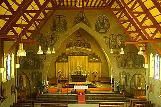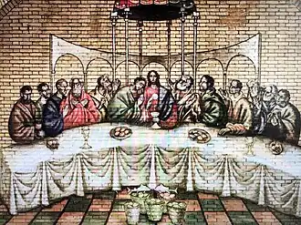 Op de achterwand van de kerk, hoog boven het hoogaltaar is het laatste avondmaal aangebracht. De figuren zijn meer dan levensgroot en zijn geplaatst in een pseudo-architecturale ruimte, gesuggereerd door de gebogen vormen van de tafel en van de door zuilen gedragen structuur achter de figuren. De voorstelling laat het dramatische moment zien dat Christus heeft meegedeeld dat een van de aanwezige apostelen hem die avond zal verraden; een van hen werpt zich tegen de borst van Jesus om te vragen wie de verrader zou zijn. Dit moment is gecombineerd met het belangrijkste moment van het laatste avondmaal: het moment dat Christus brood aanbiedt met de woorden, dat het brood zijn lichaam is dat voor de mensheid wordt overgeleverd. Dit is het moment dat in iedere Katholieke mis wordt herdacht, en de viering ervan is de kern van de Katholieke liturgie rond het altaar. Hoog op de triomfboog is de kruisiging afgebeeld, met Maria en Johannes naast de stervende Christus. De verrijzenis van Christus is te zien boven de top van de boog, waarmee het wezen van de Christelijke verzoeningsleer in deze drie voorstellingen – laatste avondmaal, dood aan het kruis en verrijzenis in beeld is samengevat. De overige voorstellingen op de triomfboog verbeelden de zeven sacramenten van de Katholieke Kerk.