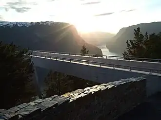 Vanaf een parkeerplaats is een langwerpig platform van staal en larikshout gemaakt met uitzicht op het onderliggende Aurlandsfjord. Het geheel is 4 meter breed en 30 meter lang en ligt 640 meter boven de zeespiegel. Een dikke glazen plaat aan het einde van het platform verbetert de ervaring van het machtige landschap en geeft een uniek uitzicht op het fjord.