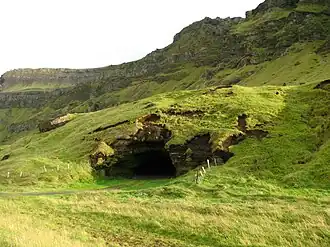 Voor de grot ligt een klein meertje, Hellisvatn. Men beweert dat er een kelpie in huist.