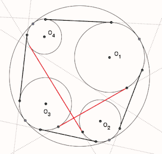 Laat een cirkel zijn, en en vier elkaar niet snijdende cirkels die in liggen, en in volgorde raken aan . Laat vervolgens de lengte zijn van de uitwendige gezamenlijke raaklijn aan en . Dan geldt: