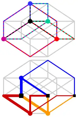 In de volgende afbeelding wordt met behulp van de stelling van Kuratowski bewezen dat de graaf die een hypercubus representeert, niet planair is: