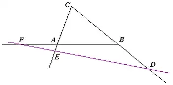 Het teken van de linkerkant van de vergelijking van de stelling is negatief: Lijn DEF snijdt de zijden een even aantal keren: