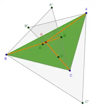 De twee gelijkzijdige driehoeken van Napoleon die zo ontstaan, hebben een verschil in oppervlakte gelijk aan de oppervlakte van de gegeven driehoek.